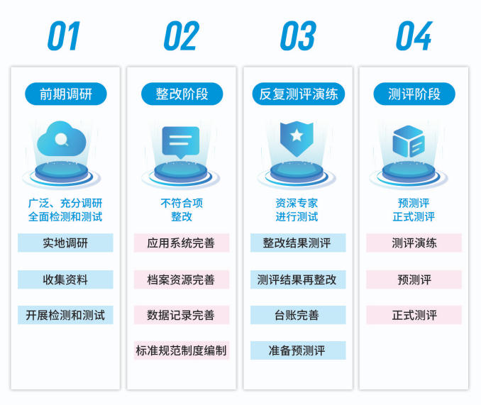 服务覆盖项目“前期调研,全面整改,测评演练,正式测评”全生命周期,一站式便捷服务省时省力更省心。